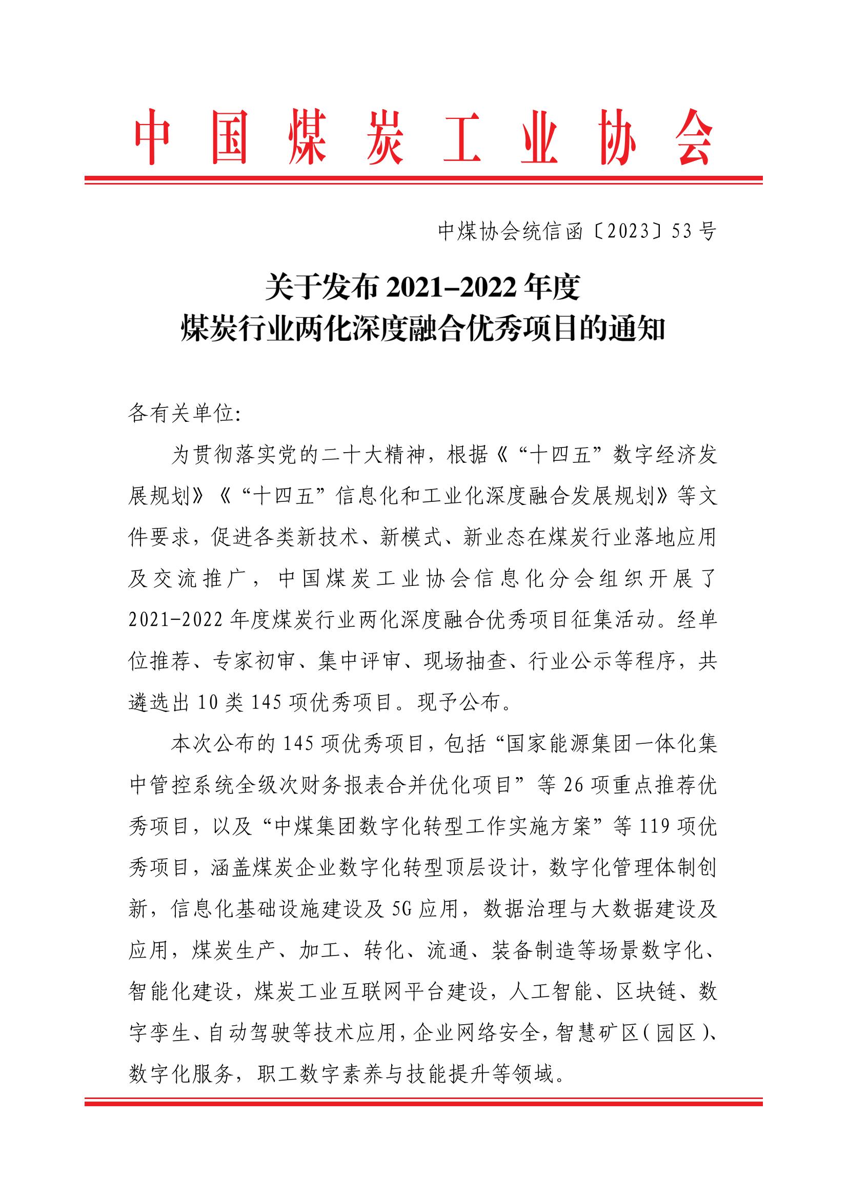 7月14日,中国煤炭工业协会下发《关于发布2021-2022年度煤炭行业两化深度融合优秀项目的通知》。