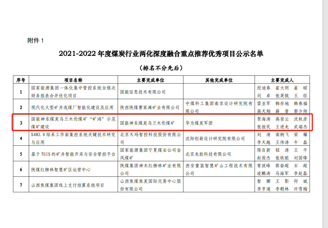 其中,乌兰木伦煤矿“国能神东煤炭乌兰木伦煤矿‘矿鸿’示范煤矿建设”项目被评为重点推荐优秀项目。