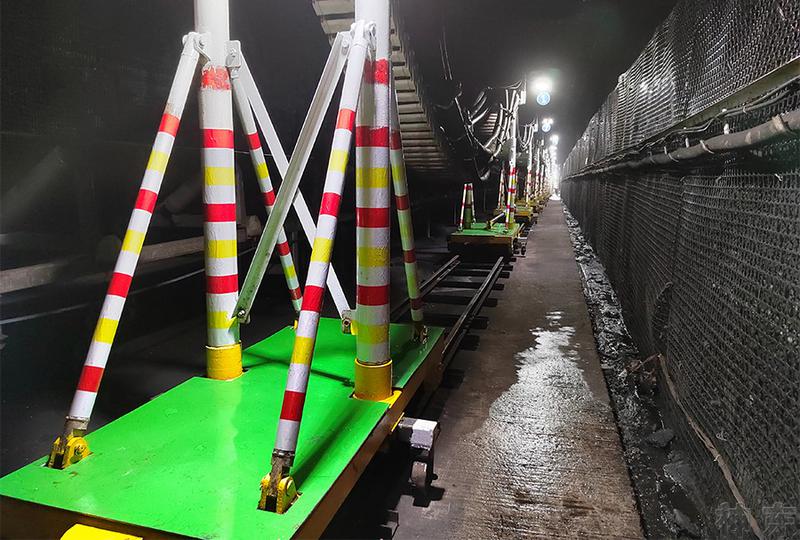 此外,该矿还对设备列车也进行了升级改造,应用了单轨吊落地及自移列车装置。此装置由1台支撑车、1台牵引车、18节设备小车和12节管缆伸缩车组成。当工作面推进时,能通过支撑车前移、支撑车撑顶、桁架前移、滑架前移、列车升起前移落地、支撑车收回的流程进行移动。并加装防跑车装置,对巷道坡度起伏的适应性更强。目前拉设备列车只需20分钟,每两天拉移一次移变,每次时长可控制在1小时以内,实现了设备列车和管缆的安全、高效、高标准管理。